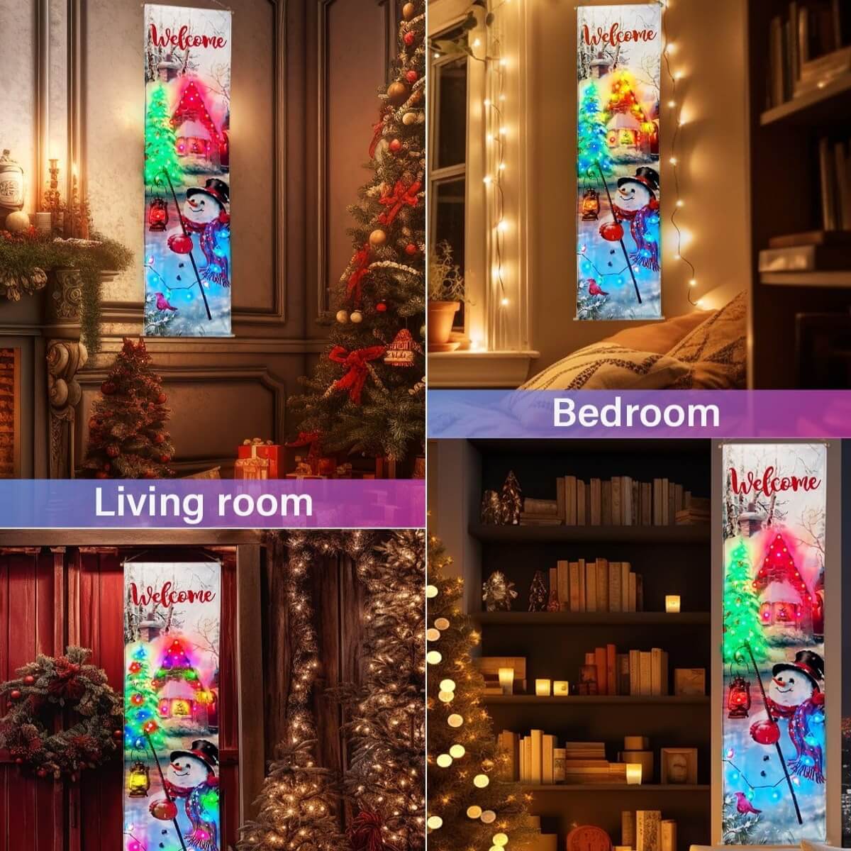 ● LIGHTED SNOWMAN CHRISTMAS TREE LANDSCAPE SCENE – Light up snowman and landscape scene is a beautiful way to enhance the winter/Christmas feeling. Customizable LED lights to create the beautiful illusion of village lights including xmas lights, tree lights, house lights on the artwork. Measures 62″ H x 16″W. Perfect size to be hung in a hallway, kitchen or living room for the holiday season.
