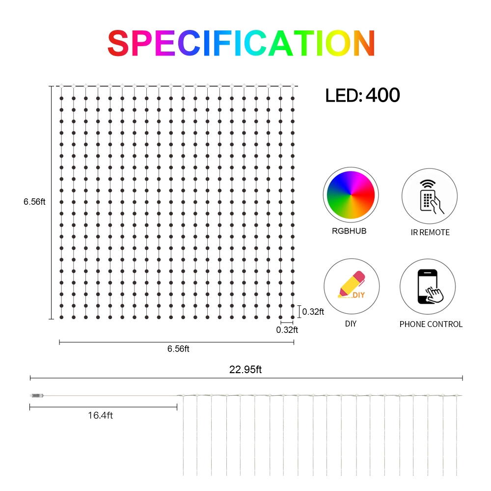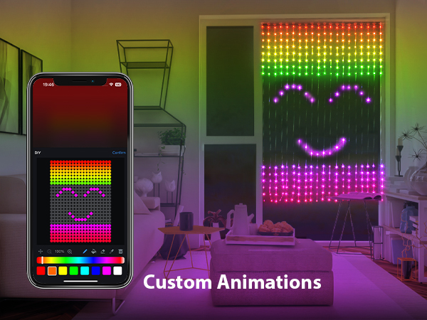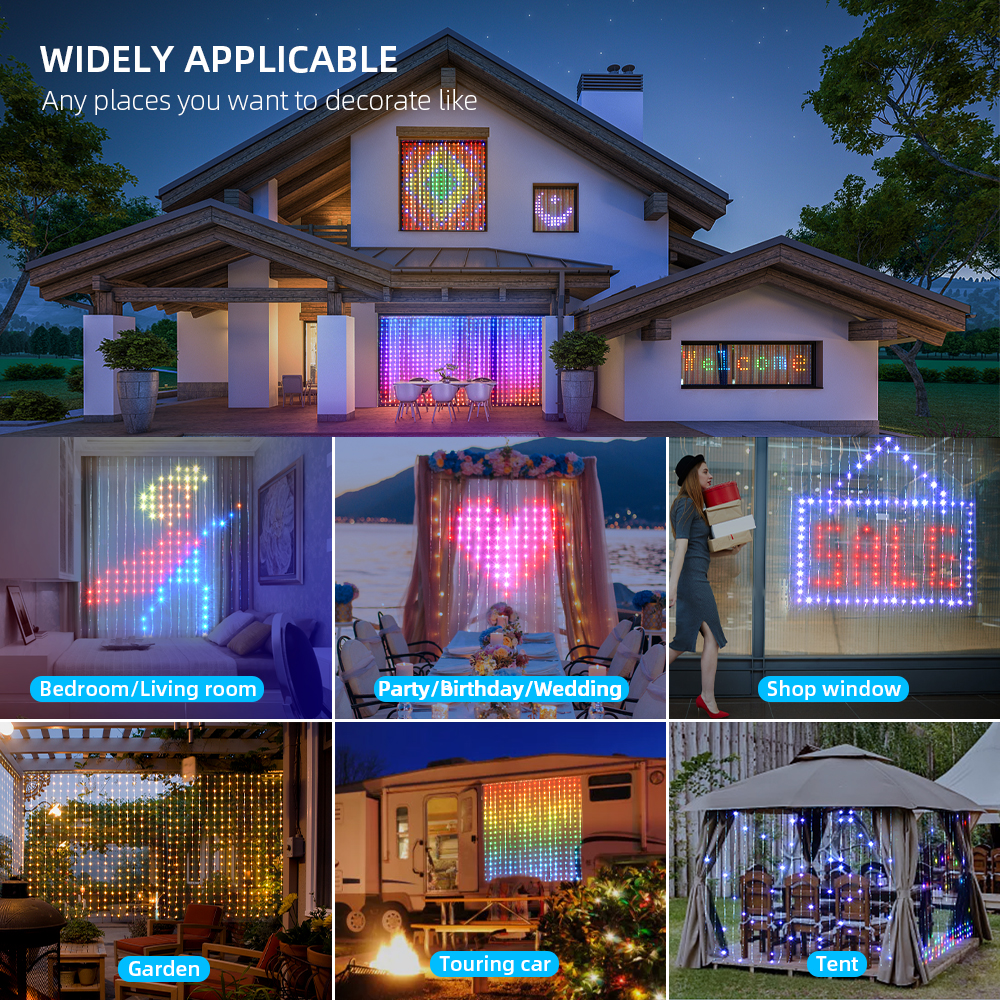 - Smart Curtain Lights with DIY Editable Patterns: In addition to the preset patterns, you input any text or pattern you want to show, which can be dynamically displayed. LED smart curtain lights make interesting fonts, pictures, colors, and copy to perfect your imagination, add more dimension to your