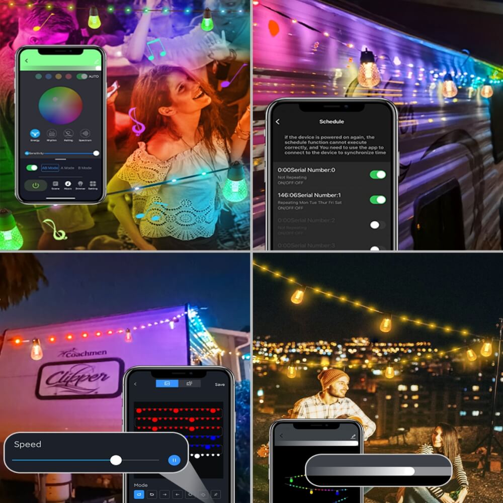 ● [MUSIC SYNC] The integrated mic in the smart outdoor string lights allow it to react to your music, making it perfect for any party or romantic night out.